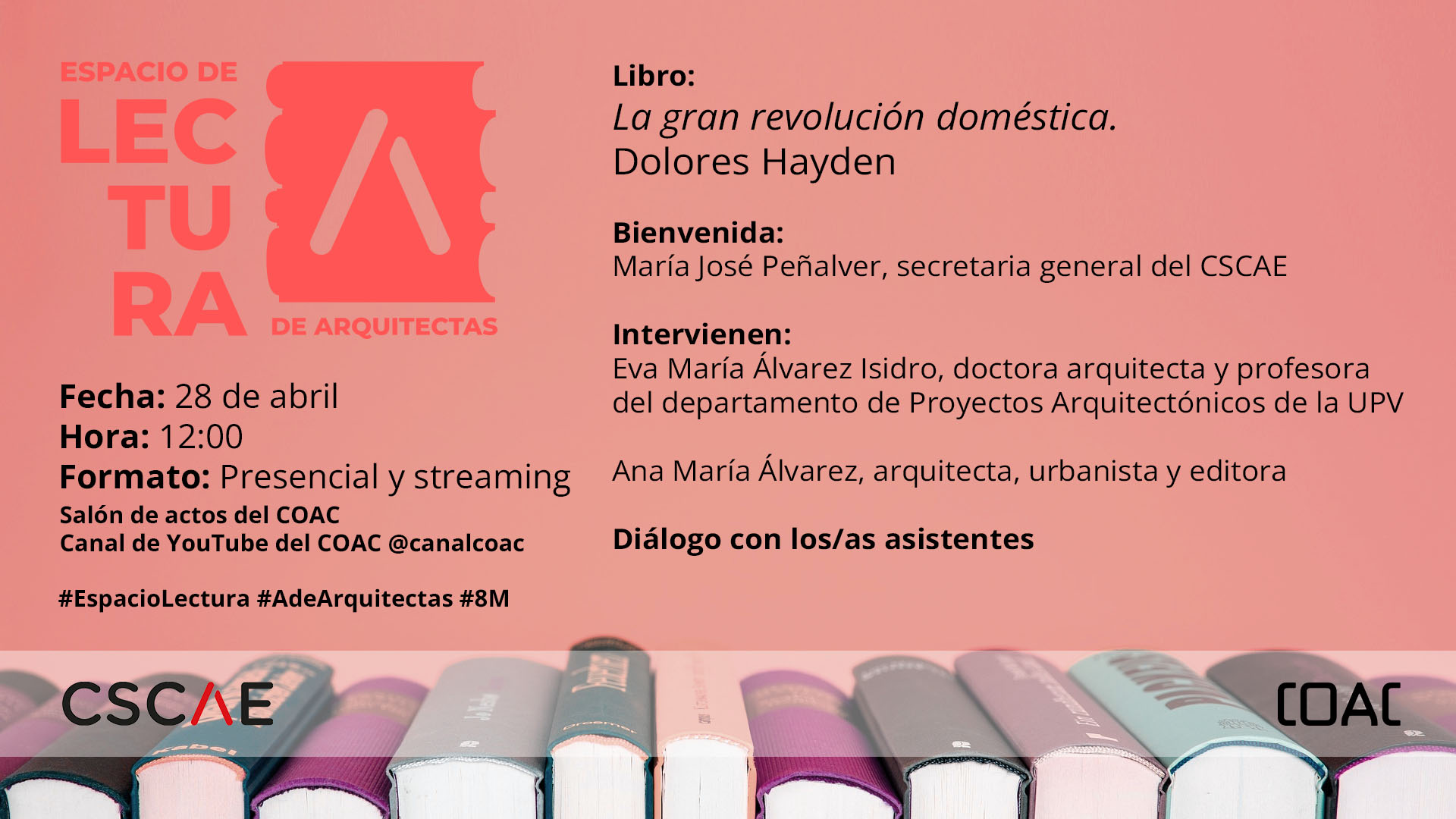 El Espacio de Lectura “A de Arquitectas” arranca como un lugar de diálogo y aprendizaje para reconocer la influencia de las mujeres en la ArquitecturaEl segundo encuentro tendrá lugar en el COAC, el próximo martes, 28 de abril, a las 12 horas, con el libro “La gran revolución doméstica” de Dolores Hayden.